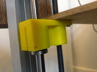 - Depuis le début je n'étais pas satisfait du déplacement de l'axe Z. Au mieux, il provoquait des irrégularités en forme de vague sur la surface, la fréquence étant celle du pas de vis, au pire, l'imprécision des épaisseurs des couches faisait planter l'impression. J'ai fait plusieurs tentatives, je suis finalement revenu à la conception initiale qui inclue 4 écrous, 4 tiges filetées M8 (une dans chaque angle), 4 roulements linéaires et 4 tige lisses de 10mm. Cela donne de bien meilleurs résultats et l'axe Z bouge sans frottements. Voici ce que cela donne :